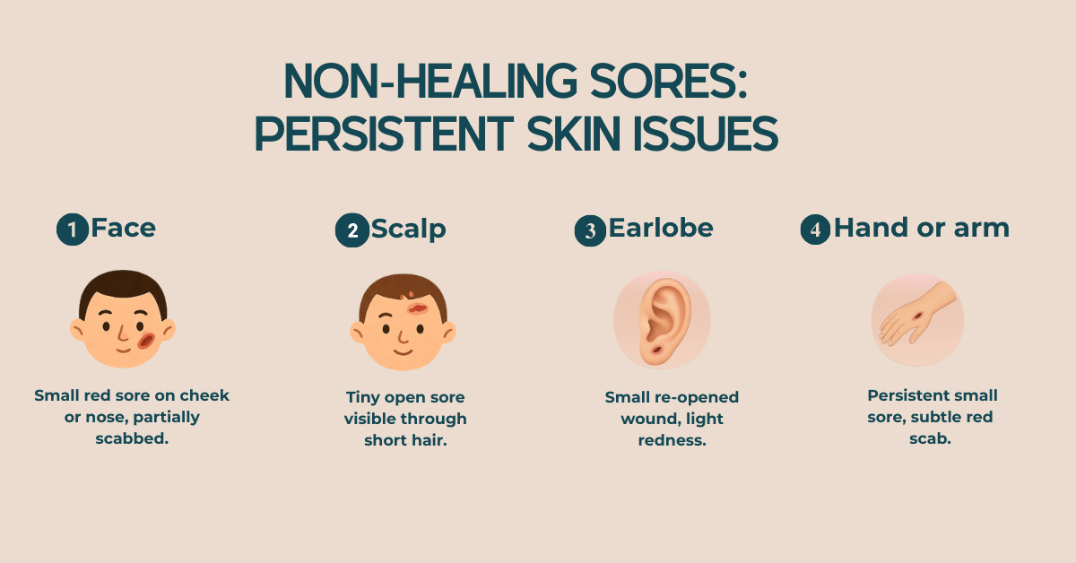 The rule of thumb: any sore that hasn't healed within 4 weeks should be evaluated by a doctor. This applies anywhere on the body, but especially on the face, ears, scalp, and neck areas that see the most sun over a lifetime.